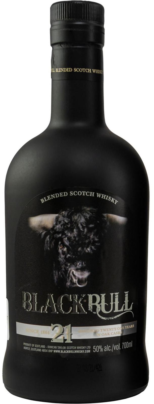 Black Bull 21yo je mimořádným blendem velmi starých a vzácných whisky. Ve finálním blendu zastoupen ještě výraznější podíl vybraných single malt whisky (75% single malt/25% single grain/50% alc.vol.). Ke zdůraznění unikátní jemnosti pomáhá i zde vyšší zastoupení sudů po sherry použitých při finálním staření. Vyšlechtěno k dokonalosti - výroba takto starých whisky probíhá logicky opravdu v malých dávkách – výsledkem je krásně vybalancovaná, komplexní whisky s neobvykle širokou škálou příchutí a tónů. Zachutnala i řadě znalců na řadě prestižních mezinárodních soutěží a expertních panelů.